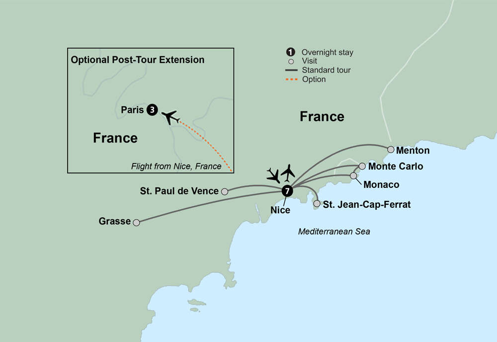 It’s time to live the good life and embark on a getaway to the fabulous French Riviera, or Côte d'Azur. With its elegant coastal resorts, superb eateries, chic boutiques, and captivating museums, it’s the ultimate sunny retreat for the elite. Unpack your bags just once and stay at a single hotel for your entire adventure, which begins with an overnight flight to France.